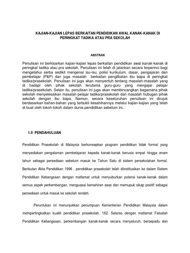 Doc Kajian Kajian Lepas Berkaitan Pendidikan Awal Kanak Kanak Di Peringkat Tadika Atau Pra Sekolah Wow Good Academia Edu