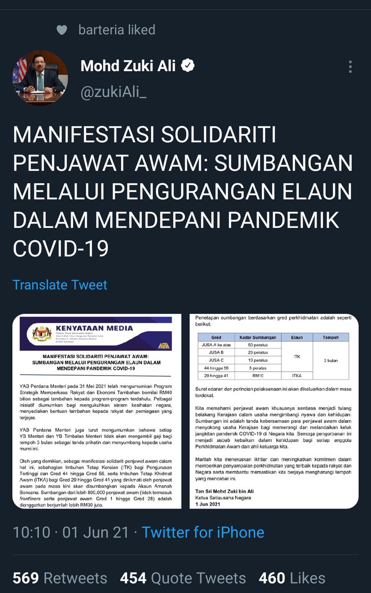Sebaliknya terdapat ramai yang tidak ada pendapatan sama sekali kerana tidak bekerja atau berniaga lagi kata Presiden. Bekas Perdana Menteri Tun Dr Mahathir Mohamad hari ini berkata jika gaji menteri dipotong sebanyak 30 peratus beliau yakin mereka tidak akan kebuluran. Pelaksanaan pemotongan gaji menteri ini akan berkuat kuasa dengan serta merta.